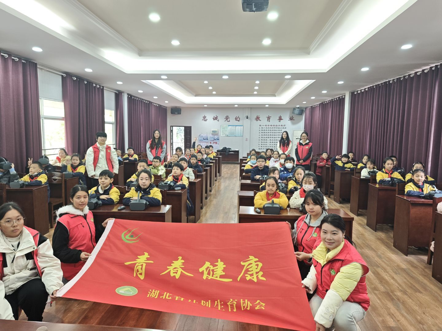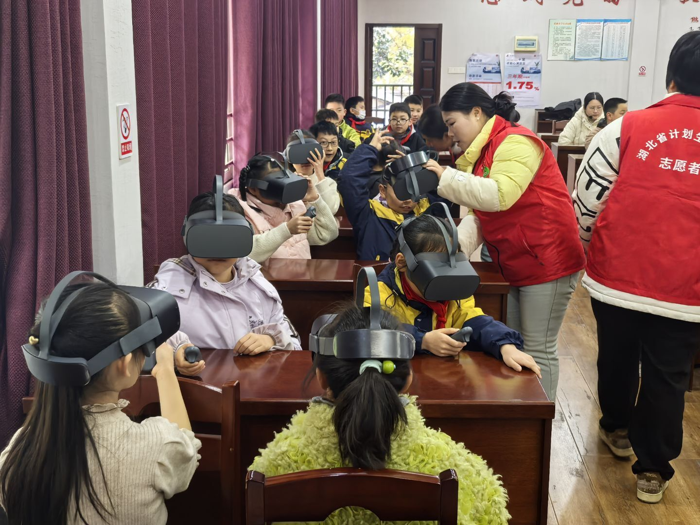 同伴教育的余温未散,充满科技感的VR体验活动便接续登场。在专设的体验区,志愿者们耐心细致地协助四个年级的同学们佩戴、调试设备,确保每一位孩子都能获得绝佳体验。戴上VR眼镜,孩子们瞬间穿梭于虚实之间:时而漫游在星河璀璨的浩瀚宇宙,时而沉浸于趣味盎然的益智游戏,时而在生动鲜活的视频场景中完成知识学习。这场新奇的科技之旅,不仅点燃了孩子们的探索热情,更以多感官交互的方式,为他们拓宽了认知世界的全新维度。