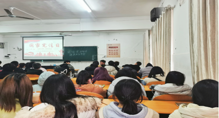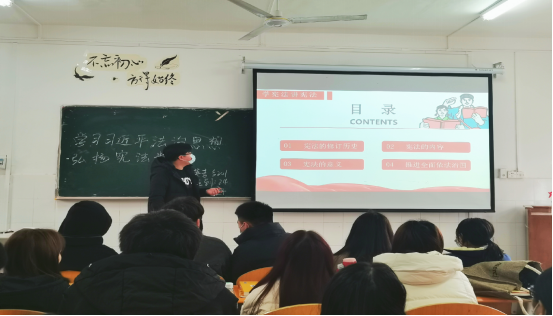 本网迅(见习记者:侯璐飒)12月3日下午14点,我校开展每周团课,本周团课主题为“深入学习习近平法治思想,大力弘扬宪法精神”。我系各班班委组织主题团课,系学生会监督维持团课纪律,保障团课高质量,高效率等特点。积极为我系学生学习习近平法治思想和国家宪法意识。