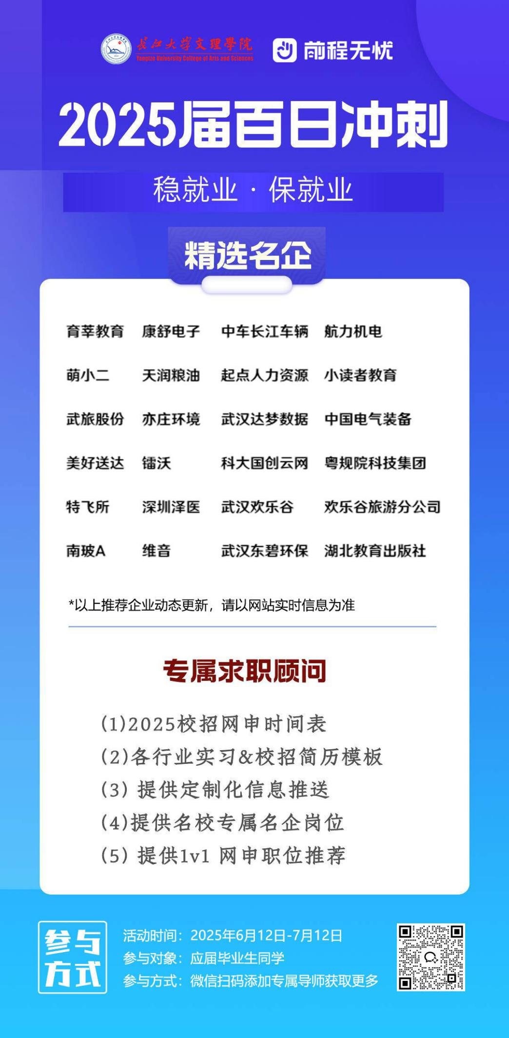 本次活动前程无忧利用自身平台优势、企业资源、就业策划指导团队,为大家提供优质企业岗位,专属名企内推、专属导师1v1、提高学生简历制作水平、行业选择敏感度、岗位匹配精准度、面试熟练度和技巧性,同时增加广大毕业生获得优质offer的机会。
