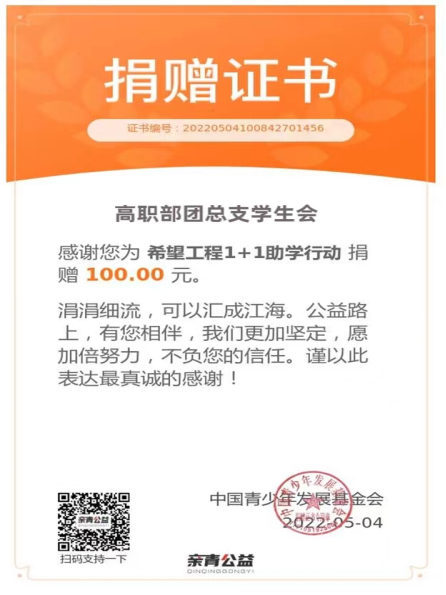 希望工程1+1助学行动 捐赠证书