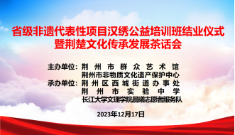 本网讯(通讯员王晓芸)2023年12月17日,荆州市非遗中心联合西城街道办事处、yl7703永利集团晨曦志愿者服务队分别在实验中学附属小学和西城街道办开展了2023年省级非遗代表性项目汉绣公益培训班,通过48个课时已全部结束。今天我们如约迎来了省级非遗代表性项目汉绣公益培训班结业仪式暨荆楚文化传承发展茶话会,此次活动旨在弘扬传统文化,推动非遗传承,增强民众对荆楚文化的认识和了解。
