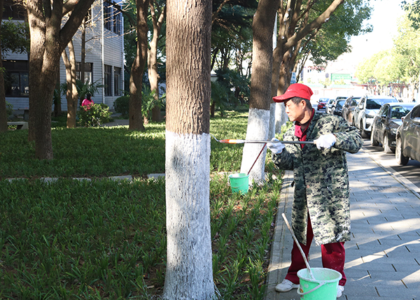 今天(11月10日)上午,后勤保障处安排一批工人正在对城中校区主干道两侧树木进行刷白。大家按照比例配置涂白石灰,细心涂刷,确保树穴、地面干净整洁,使涂白树干高度统一、颜色均匀,让校园树木保持美观一致的同时,起到良好的防病虫害效果。据悉,此次将对城中和西校区的千余株树木进行刷白,工期20多天。学生记者 李彦君 熊嘉怡 见习记者 赵安欣 摄影报道