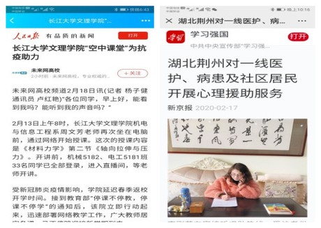 学院实时更新防疫热点新闻,大力讴歌身边先进典型,生动讲述师生感人故事,并在微信公众号同步刊发,教育引导师生党员在防控疫情工作中走在前、干在先、做表率。2月18日,中央新闻媒体人民日报人民号、未来网和今日头条、百家号、趣头条等媒体,以《yl7703永利集团“空中课堂”为抗疫助力》为题,报道学院停课不停教、停课不停学。2月17日,中央新闻媒体学习强国以《湖北荆州对一线医护、病患及社区居民开展心理援助服务》为题,报道学院开展心理援助服务抗疫。2月19日,地方新闻媒体e线民生荆州无线以《特约记者行:老福利院居民的贴心人》为题,报道学院教师在居住地社区开展抗疫工作。