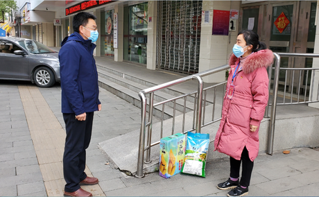 在荆东社区荆东路行署疫情防控卡点,朱继平详细了解了刚从超市采购物品发放给居民的人文与传媒系党总支副书记周芳的日常工作情况,鼓励她发挥专长,扛起旗帜,细致工作。周芳每天除了正常的卡点值守和临时工作外,还要配合采购组负责辖区内564户1699人日常生活物资的采购信息登记、汇总、采买、分发及配送等相关工作。