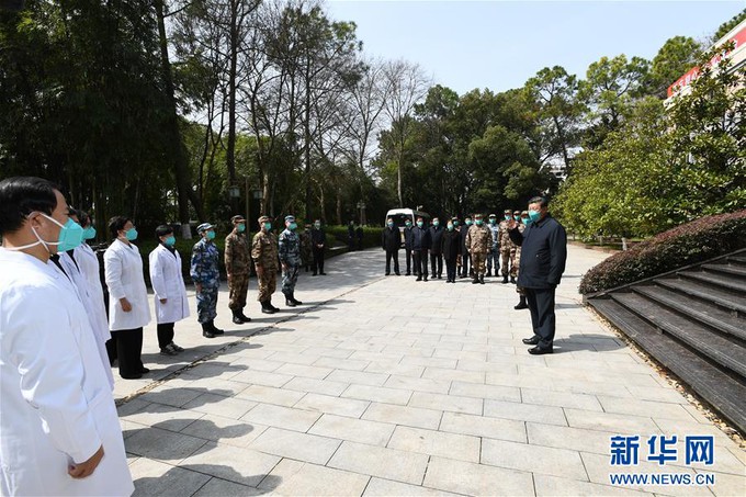 在火神山医院指挥中心,习近平听取医院建设运行、患者收治、医务人员防护保障、科研攻关等情况介绍。习近平指出,疫情发生以来,包括军队在内的广大医务工作者发扬特别能吃苦、特别能战斗的精神,义无反顾奔赴湖北和武汉,毫无畏惧投入防控救治工作,日夜奋战,舍生忘死,不负重托,不辱使命,同时间赛跑,与病魔较量,为武汉疫情防控工作作出了重要贡献。军队医务人员牢记我军宗旨,召之即来,来之能战,战之能胜,为党旗、军旗增添了光彩。沧海横流,方显英雄本色。你们真正做到了救死扶伤、大爱无疆。你们是光明的使者、希望的使者,是最美的天使,是真正的英雄!党和人民感谢你们!