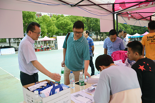王文凯(左二)、朱继平(右二)现场指导迎新工作