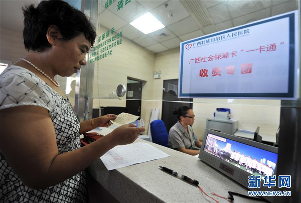 在广西壮族自治区人民医院,从北海到南宁异地就医的郑晓荣持社会保障卡在结算医药费(2015年6月30日摄)。新华社记者李斌摄