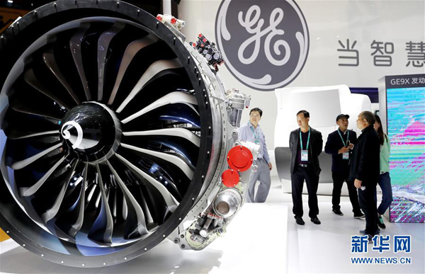 参观者在上海举办的首届进博会智能及高端装备展区观看展出的飞机发动机模型(11月5日摄)。新华社记者方喆摄