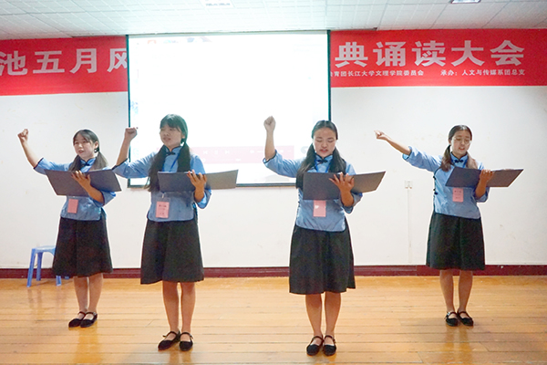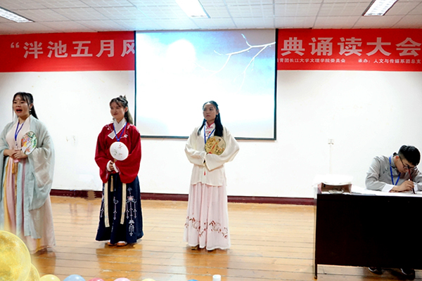 “汉黄重色思倾城,御宇多年求不得……”黄齐同学将古诗词配以现代流行音乐,带领同学在优美的旋律中领略诗词之美,赢得老师的一致好评。何玮琳等同学诵读的《春江花月夜》用优美的意境、优雅的表演、激情的诵读给观众献上了一场震撼心灵的听觉与视听盛宴。董丽等同学激情诵读《我的南方和北方》,让我们领略到中华传统文化的源远流长。