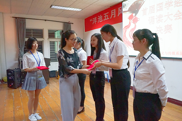 本网讯(见习记者 何蝶 赵娟 贺晶晶)诵国学经典,品盛世文化。5月18日晚,第十二届“泮池五月风”科技文化节之首届国学经典诵读大赛决赛在城中校区3教403教室落幕。人文与传媒系张曦、朱文霞老师、图书馆何年老师、中师5141班鹿陶陶同学担任评委,80余名同学现场观摩。