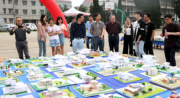 本网讯(见习记者 刘文婷 汪林)5月17日中午,在西校区设计系展厅,我院第十二届“泮池五月风”科技文化节之建筑模型设计大赛闭幕式暨颁奖典礼举行。两百余名师生观摩比赛。我院副院长郭睦庚教授,建筑与设计系主任张系斌教授、党总支书记许梦怡、副书记关莉红、建筑教研室主任田从祥和有关职能部门负责人先后来到现场观看比赛并作出指导。