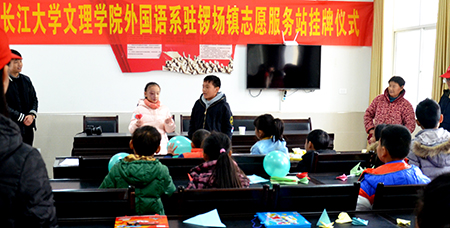 在锣场镇新锣社区党员群众服务中心,我院外国语系锣场镇志愿服务站正式挂牌成立。外国语系青年志愿者协会指导老师梅曼曼为锣场镇留守困难儿童送上羽毛球、篮球、画笔等文体用品。