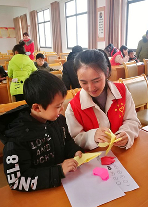 在皇陵村村委会会议室,志愿者结合专业所学,分小组为留守儿童辅导功课,与孩子们亲切交流沟通,开展诗歌朗诵、基础绘画、手工折纸等特色课程和活动,鼓励他们克服困难,好好学习,将来以优异成绩回报父母和社会。