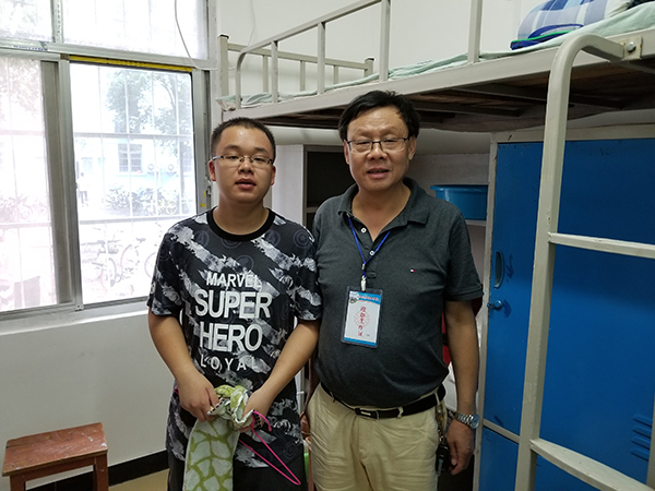 在2号学生宿舍,梅平与动物医学专业的新生龙子文一家进行了热情交流,为家长介绍了该专业的基本情况和学院对学生日常管理的做法,并与学生合影留念。
