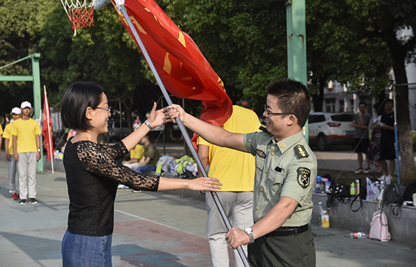 本网讯(记者 刘磊)9月13日上午,我院在西校区、城中校区先后举行2017级新生军训开训暨授旗仪式。学生工作处处长刘磊为军训方队授旗,宣布2017级新生军训正式开始。此次共有7个营、19个连参加军训,军训内容包括军事技能训练、防身技能训练、内务整理训练和军训成果汇报,为期9天。