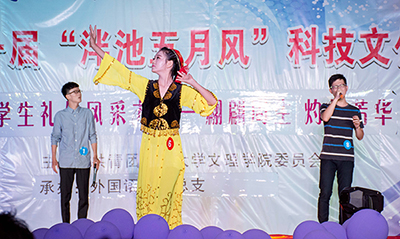 在礼仪展示环节中,充满青春活力的学子身着旗袍,向观众们展示了迎宾礼、让座礼等礼仪;上一届的参赛选手进行歌舞表演;在风采展示中,3号选手宋昌盛和4号选手曹子豪带来歌曲对唱《友情岁月》,6号选手吴子涵朗诵《老水手的歌》,1号选手张雨琪、8号选手刘冬明和6号选手秦莹为大家带来新疆歌舞《一见钟情》……舞蹈串烧、歌曲串烧、串场表演把大赛一步步推向高潮,现场掌声不断。