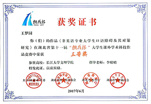 外国语系选送的2件参赛作品,王梦园同学的《非英语专业大学生口语障碍及其对策研究》、张雅芳同学的《智能手机应用程序在大学英语学习中的应用研究》,经严格评选,均获三等奖。