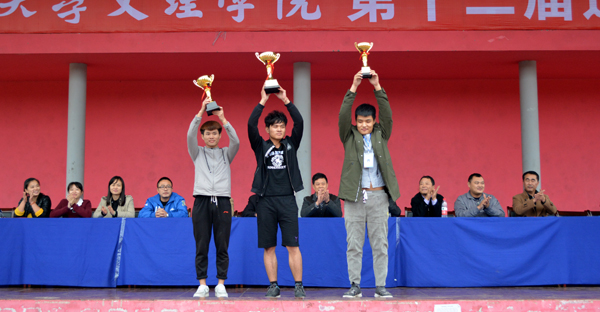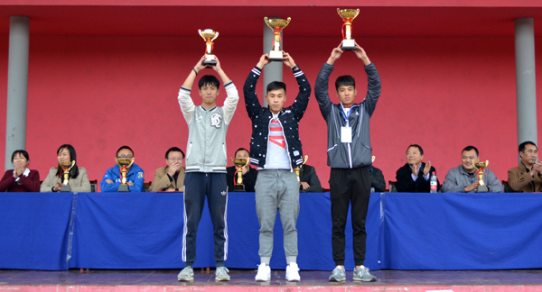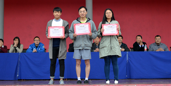 男子团体总分前三名(机电系、经贸系、工商系)代表领奖