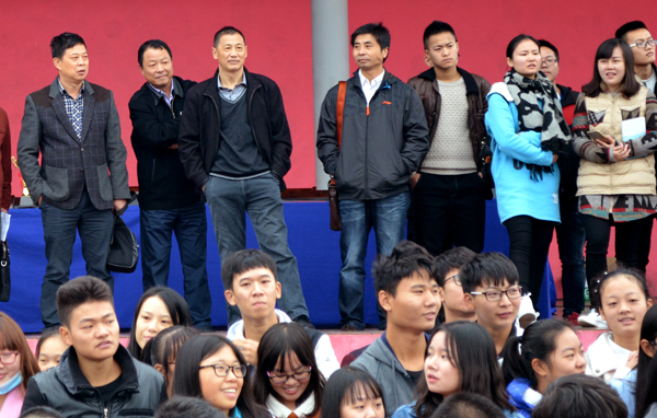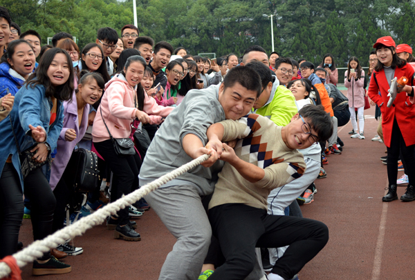 院领导(从左至右:文谟汉、郭明虎、曹骥、郭睦庚)与同学们一起观看拔河决赛