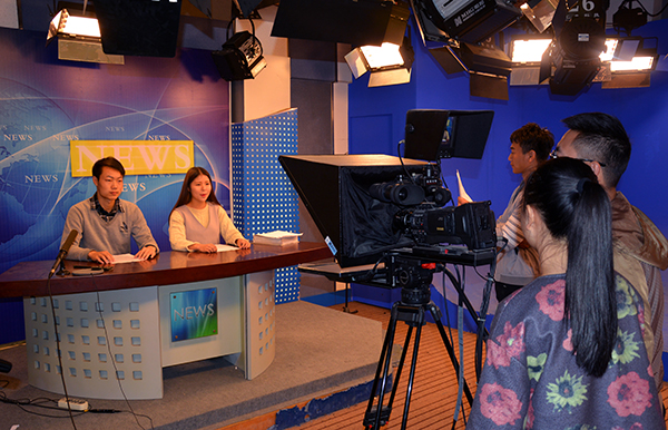 在1教5楼灯火通明的演播厅内,气氛紧张,校园电视台节目组正紧锣密鼓的“制作”节目。播音台上,作为“门面”的女主播亮相。她仪表端庄、气质优雅,十分“抢镜”。作为2016级广电专业的新同学,伍晶晶今天在大二学长的带领下,体验试播感受。
