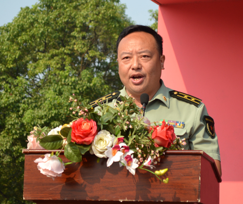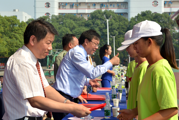 王金琼代表学院向荆州军分区教导大队赠送匾额,全体起立鼓掌欢送教官。