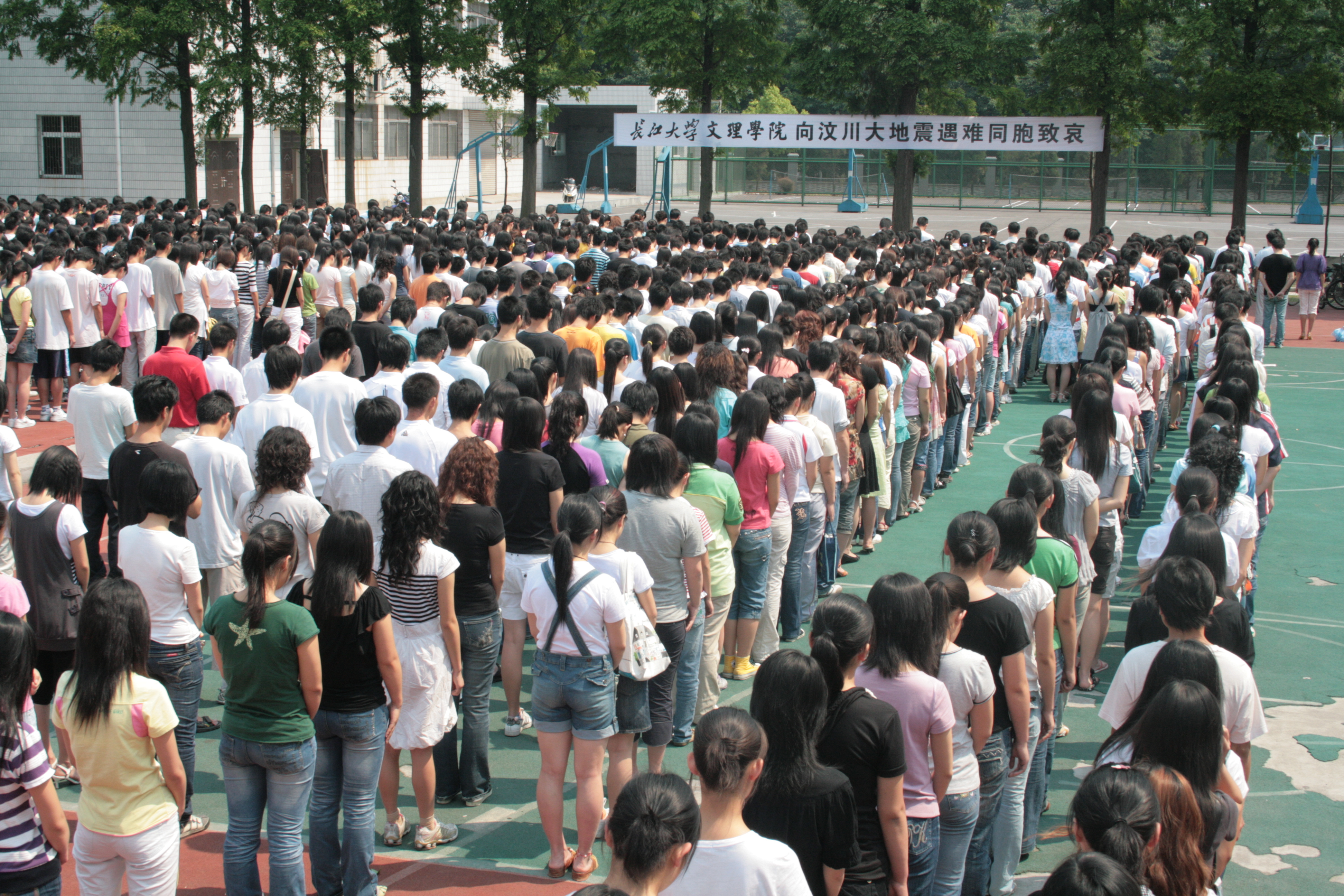 5月19日14时,学院塑胶球场就聚集了近2000余师生,在白底黑字的“yl7703永利集团向汶川大地震遇难同胞致哀”横幅前,学院全体院领导、教职工与学生站在一起,现场所有人都屏住呼吸、神情凝重,偌大的一个球场上悄然无声。14时28分,就在7天前这个让亿万中国人痛心的时刻,伴随着防空警报的响起,全体在场的文理师生低头为在四川汶川大地震罹难同胞默哀,所有上课学生和教师也在教室起立默哀。