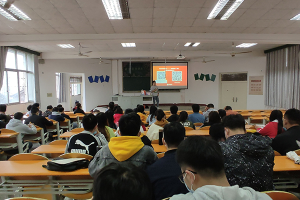 某在线教育机构主管结合PPT作详细介绍,从公司发展、招聘岗位、工作职责和福利待遇等方面进行详细介绍。他通过面对面交流、互动问答的方式,全面讲解了该公司的招聘岗位职责和网上报名、投报简历的流程,并对同学们提出的问题进行解答。