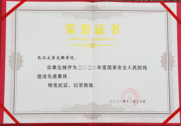本网讯(记者 刘磊)12月24日,我院被荆州市国家安全人民防线建设领导小组授予“2020年度国家安全人民防线建设先进集体”荣誉称号。