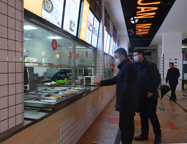 院领导一行查看了校园门禁系统、食堂、学生宿舍等区域,看望已经返校学生和相关工作人员,并对校园安全管控、宿舍水电安全管理及食堂卫生安全工作提出具体要求。