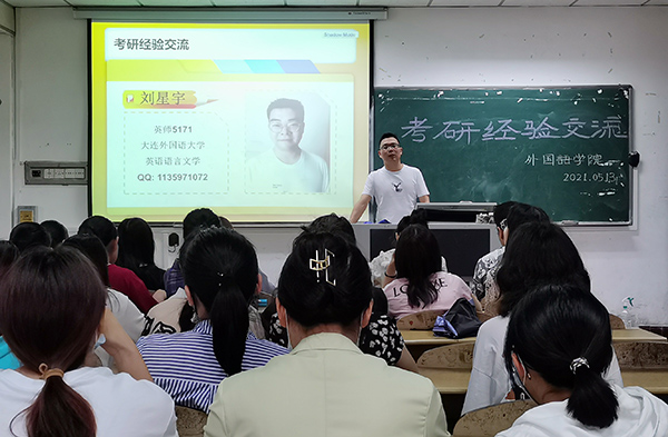 本网讯(通讯员 黄邹毅)5月13日下午,外国语学院2021年考研经验交流会在城中校区1-308教室举行。该学院党政负责人和2017级考研优秀学生、2018级全体学生参加交流会。