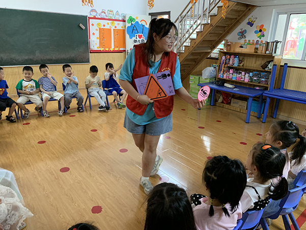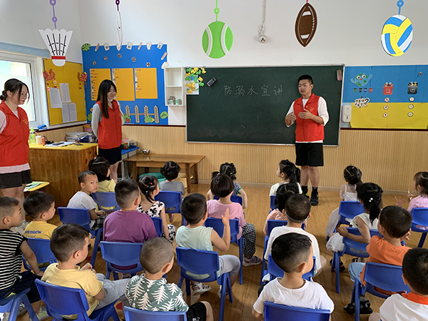 本网讯(通讯员 谭润物)近日,高职部文专班一批学生代表在支部书记黄婷婷的带领下前往荆州区神童早教幼儿园开展“防溺水知识宣讲”志愿服务活动,向幼儿普及了如何选择正确的地方游泳、游泳戏水之前的注意事项、遇到有人溺水应该怎么办等方面的小知识。8个志愿者分为3个小组分别进入A1、A2、B1三个教学班与幼儿们进行互动学习,为70多名幼儿上了一堂生动的“珍爱生命预防溺水”安全防护课。