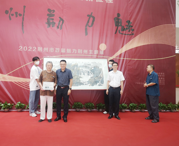 开幕式上,荆州市美协艺术家唐和先生向我院捐赠了一幅高2.3米,宽1.15米的中国画《群山荟萃》,我院党委书记朱继平为唐和先生颁发收藏证书。