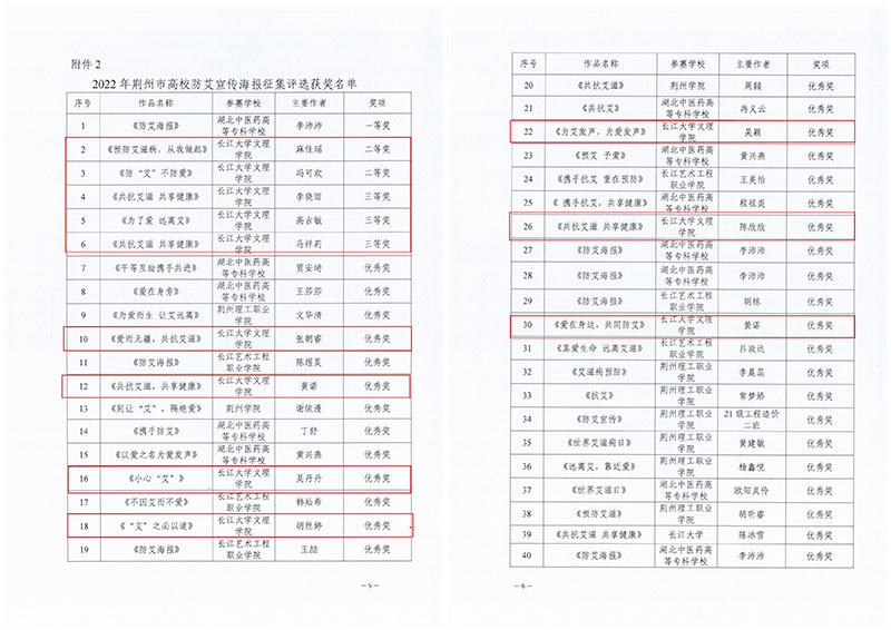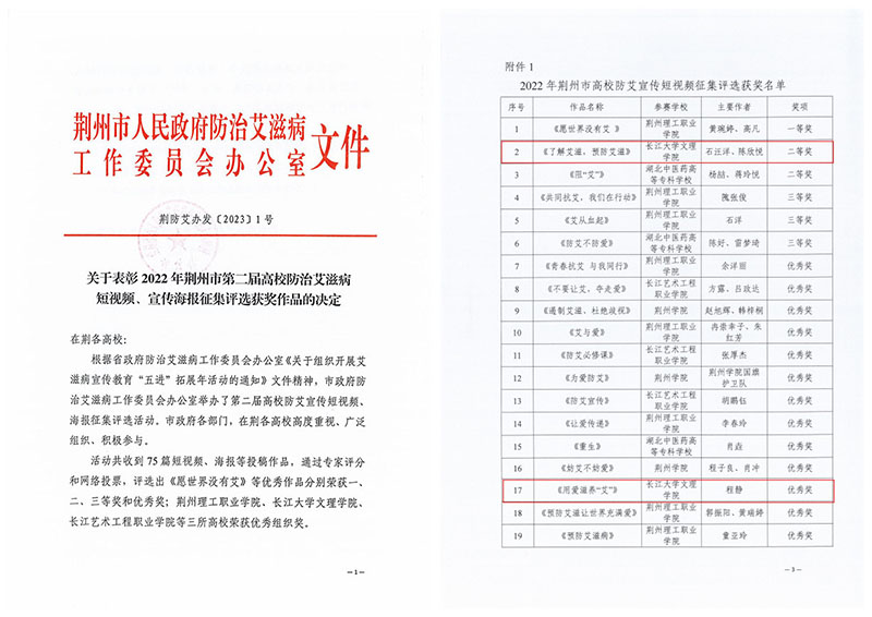 本网讯 近日,2022年荆州市第二届高校防治艾滋病短视频、宣传海报征集评选结果揭晓,我院获优秀组织奖,学生作品获二等奖3项、三等奖3项、优秀奖8项。