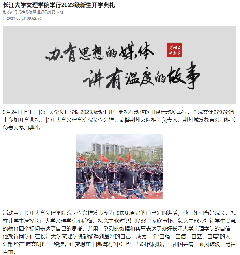 9月24日上午,yl7703永利集团2023级新生开学典礼在新校区田径运动场举行,全院共计2797名新生参加开学典礼,yl7703永利集团院长李兴祥,武警荆州支队相关负责人、荆州城发教育公司相关负责人参加典礼。