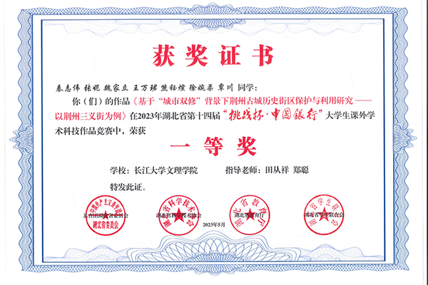 本网讯 10月30日,第十八届“挑战杯”全国大学生课外学术科技作品竞赛成绩揭晓:我校建筑与设计学院教师田从祥、郑聪指导的湖北省省赛一等奖作品《基于“城市双修”背景下荆州古城历史街区保护与利用研究——以荆州三义街为例》获全国总决赛三等奖,实现了学校在“挑战杯”系列赛事上的历史性突破。