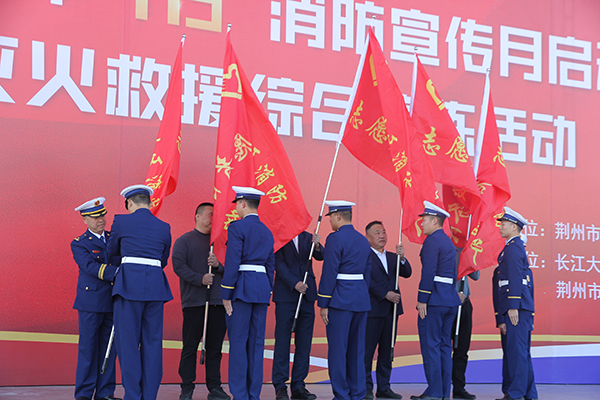 苏双岭宣读了《关于表彰荆州区2023年度消防工作先进集体和个人的决定》,我院获评2023年度消防工作先进单位。与会领导向荆州区消防志愿者服务队授旗,获奖单位代表上台领奖。