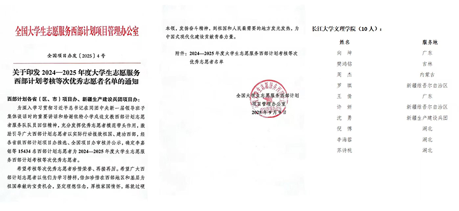 本网讯 近期,全国大学生志愿服务西部计划项目管理办公室印发《关于印发2024—2025年度大学生志愿服务西部计划考核等次优秀志愿者名单的通知》,我校向坤、樊鸿铭等10名西部计划志愿者在2024-2025年度考核中获评“优秀”等次。这份荣誉既是对志愿者们服务奉献精神的充分肯定,也是我校坚持以“两康一训”为育人导向,落实立德树人根本任务的生动体现。