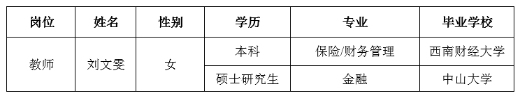 2018年4月28日,我院组织了金融学专业专任教师的招聘考核工作,经资格审查、专家考核、学院党政联席会议讨论通过,现将录用人员名单公示如下: