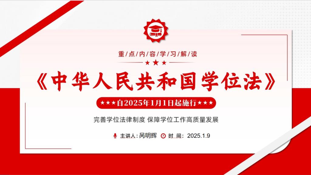会上,付兵主要从《学位法》制定的背景和过程、主要内容讲解、贯彻落实要求三个方面进行了详细讲解。他指出,《学位法》的制定是我国学位制度发展的重要里程碑,对于保障学位授予质量、促进学术创新、推动高等教育内涵式发展具有重要意义。他强调,全体教职工要认真学习领会《学位法》的精神实质,切实增强贯彻落实的自觉性和坚定性。
