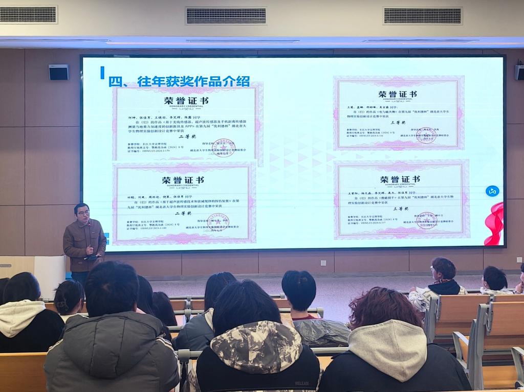 本网讯(通讯员鲁盼/文 覃美君 王烁阳/摄)2月27日,学院召开第十届湖北省物理实验创新设计竞赛动员大会,旨在激发学生对物理学科的探索热情,积极投身即将到来的物创大赛,为同学们搭建起通往科学创新的桥梁。