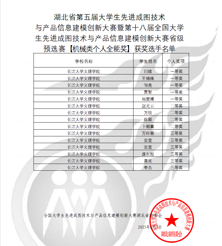 本网讯(通讯员 朱锐)近日,湖北省第五届大学生先进成图技术与产品信息建模创新大赛暨第十八届全国大学生先进成图技术与产品信息建模创新大赛省级预选赛结果在武汉理工大学公布:学院参赛学子在机械类赛道个人赛中荣获各等级奖项共14项,其中5名同学荣获一等奖,4名同学荣获二等奖,5名同学荣获三等奖。