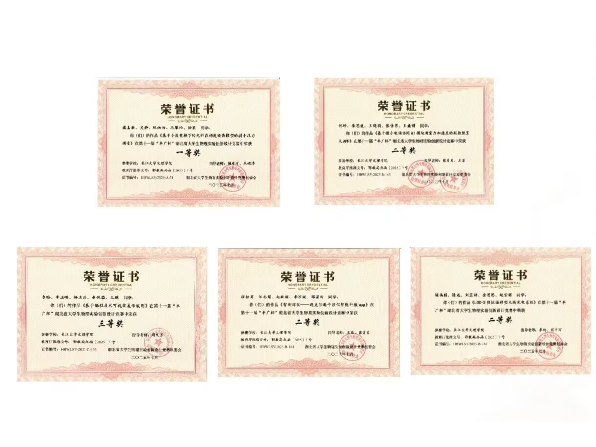 湖北省大学生物理实验创新设计竞赛是由湖北省教育厅、湖北省物理学会、湖北省高等学校实验物理教学研究会和湖北省高等学校物理实验教学示范中心联席会联合主办,属于省级A类学科竞赛,竞赛涵盖命题类创新作品、自选类创新作品和大学生物理实验讲课比赛三种类别。本届比赛吸引全省48所高校选送的786件作品参加决赛,对参赛作品的科学性、创新性与实用性提出了高标准要求。为备战此次竞赛,学院提前组建专项指导团队,围绕实验选题、成果展示等关键环节开展针对性培训;参赛学子历经校内筛选与模拟演练,反复打磨参赛方案,最终确定5支队伍晋级省级竞赛。