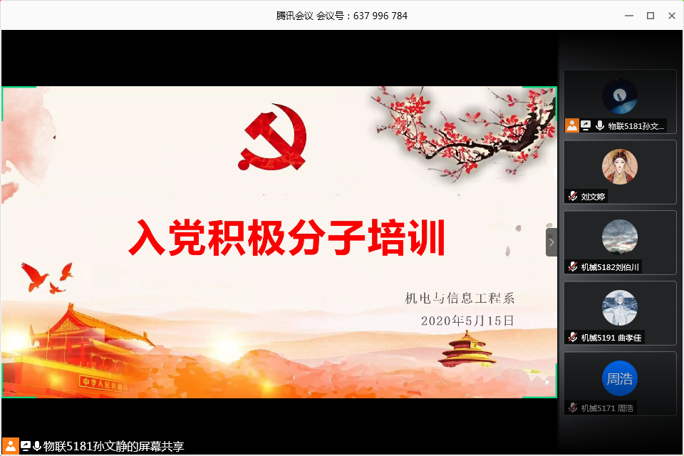 本网讯(学生记者漆丽华)5月15日中午,在腾讯会议平台,我系开展线上入党积极分子培训活动。会议由物联5181孙文静主持,系党总支副书记辛裕出席,4名预备党员、6名发展对象、45名入党积极分子参加。