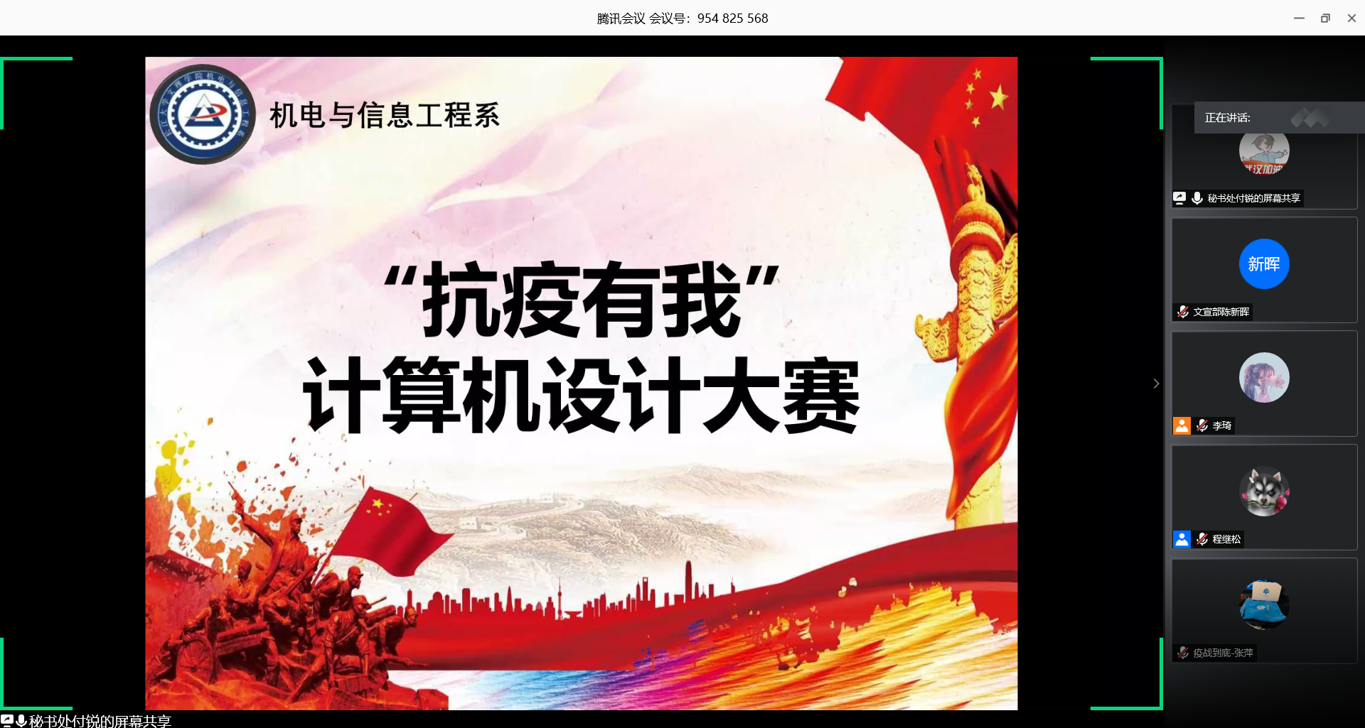 本网讯(学生记者黄懿萱)5月18日晚,在腾讯会议平台,由我系承办的第十四届科技文化节之“抗疫有我”计算机设计大赛圆满收官。本次大赛特邀系党总支书记吴海良、学院办公室副主任邓士明、教学工作部副部长刘杰、计算机教研室主任熊守丽、机械教研室主任朱锐五位老师担任评委,百余名师生在线观看。