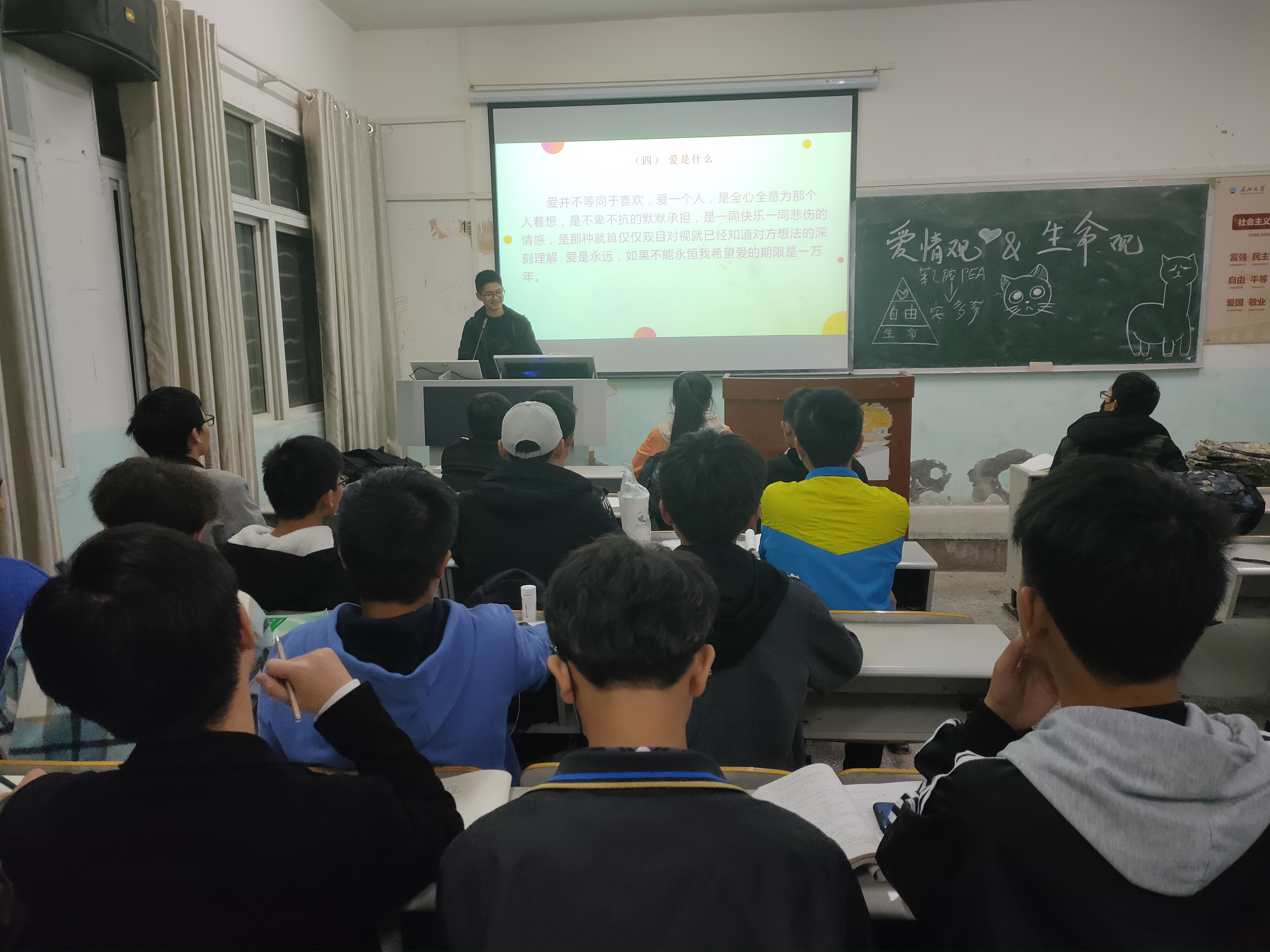 网讯(学生记者陈新晖)近日,我系各班展开“爱情观,生命观”主题班会。各班心理委员主持,我院应用心理学大四学生应邀讲解,班级同学全员参与。