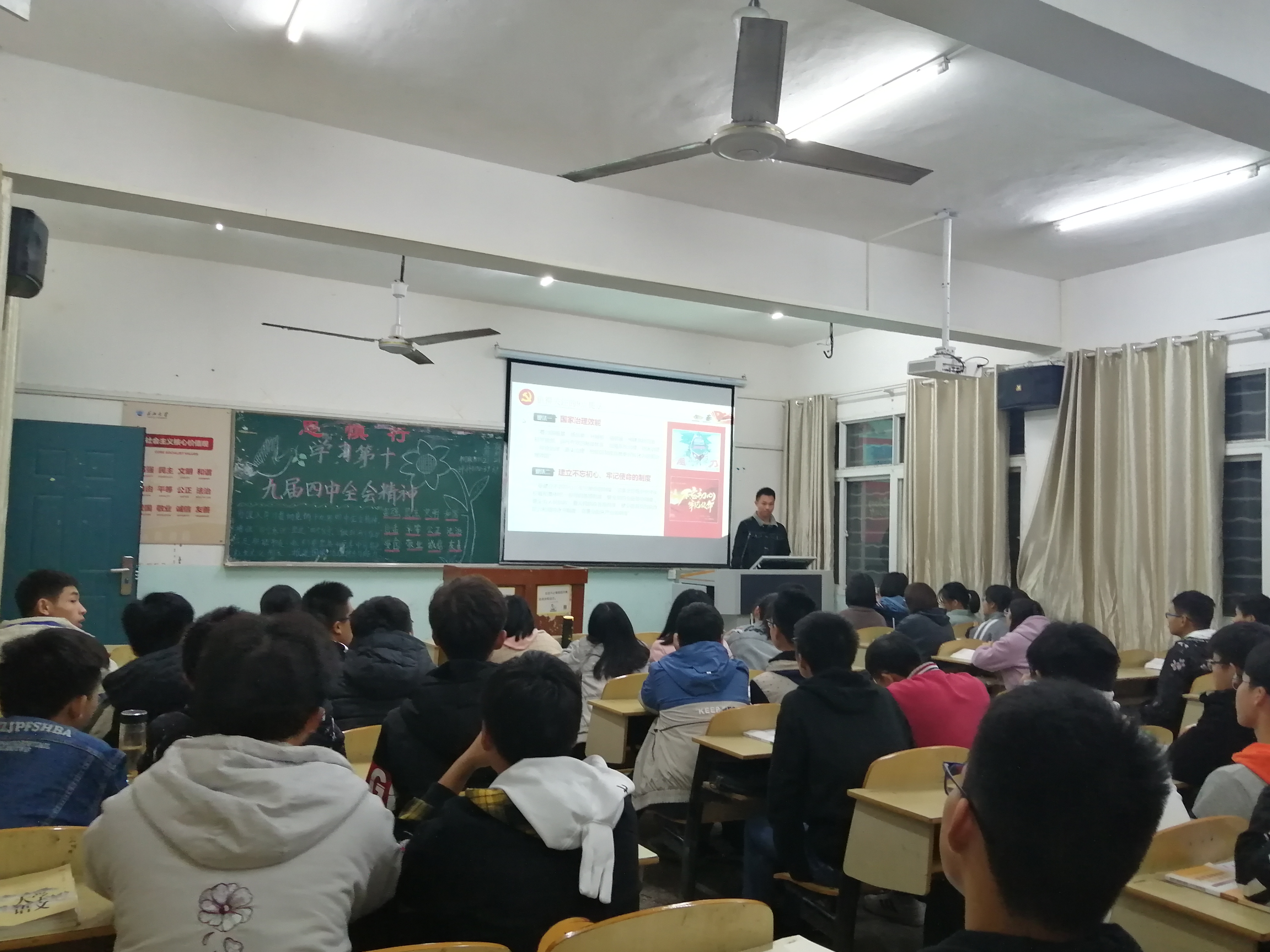 团课中,各班团支书通过视频播放与ppt展示,向同学们讲解十九届四中全会的主要内容,带领大家一起领悟习近平总书记的重要讲话精神。倡导同学们学习好、领会好、贯彻好党的十九届四中全会精神,同时增强“四个意识”、坚定“四个自信”、做到“两个维护”。