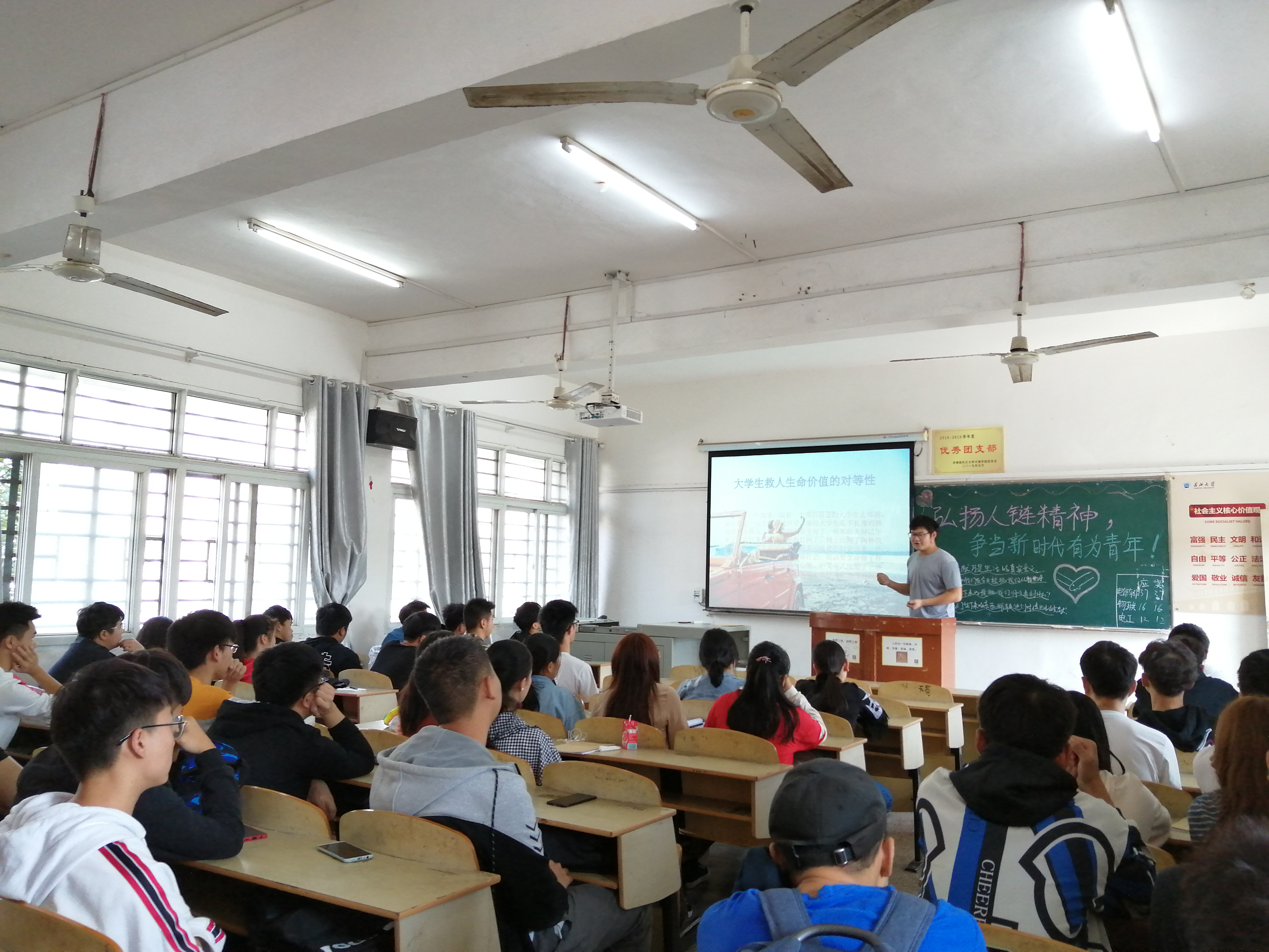 团课中,主持人通过PPT展示和视频播放的方式,向同学们详细介绍“10.24”事迹,促使同学们系统直观的了解英雄事迹,明白“人链”的含义,倡导大家弘扬人链精神,以他们为榜样,争做新时代的有为青年。
