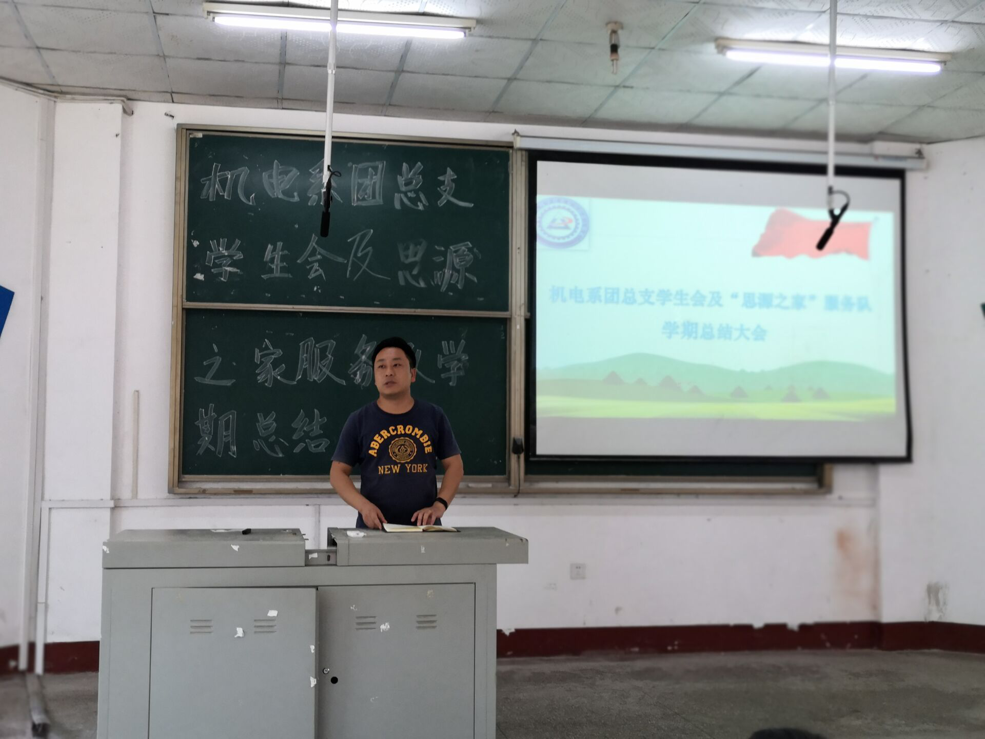 本网讯(学生记者 常伟)6月20日下午,我系团学组织召开本学期总结、培训暨表彰大会。大会由秘书处干事付锐主持,团学组织全体和各班班委一同参加,系党总支副书记辛裕出席。