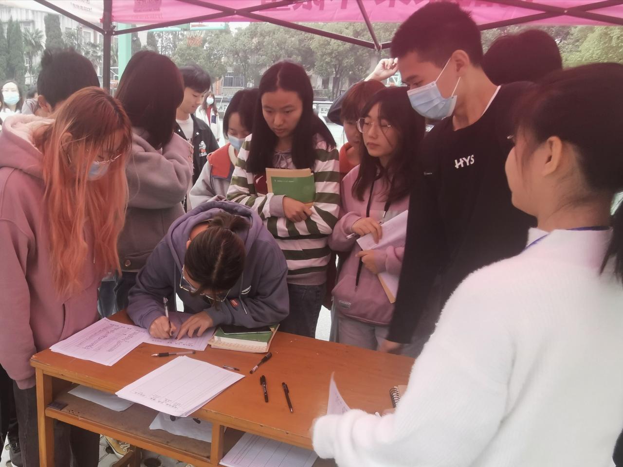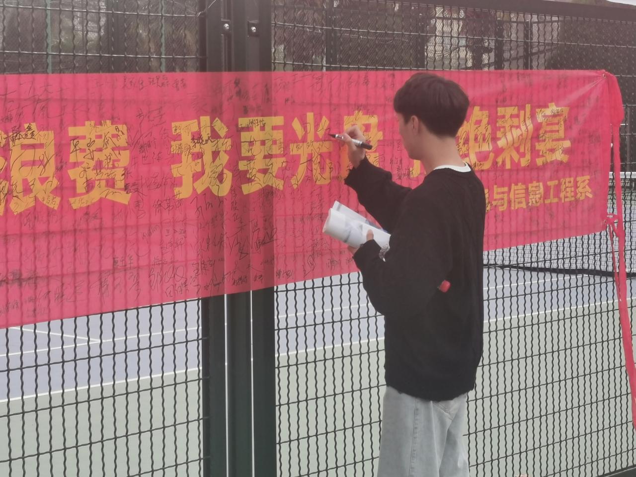 本网讯(学生记者 周晶晶)为了呼吁广大师生反对浪费,发扬中华民族勤俭节约的美好精神,倡导文明用餐的良好风气,培养健康文明的餐饮文化。11月4日至6日,我系团学组织在十二舍篮球场前开展为期三天的“我要光盘,拒绝‘剩宴’”签字活动。