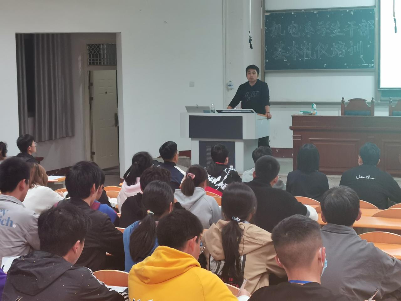 本网讯 (学生记者 周晶晶)为提升大学生个人素质和修养,塑造学生干部良好形象,掌握更丰富的礼仪知识。11月10日晚,我系在西校区四教300教室开展学生干部礼仪培训活动。系辅导员成观雄担任培训主讲人,全体学生干部参与。